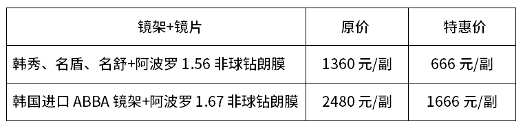 配框架眼鏡滿2666元,即贈送價值328元(兒童)或價值368元(成人)太陽眼鏡,同時還推出了多款特價爆款,具體如下: