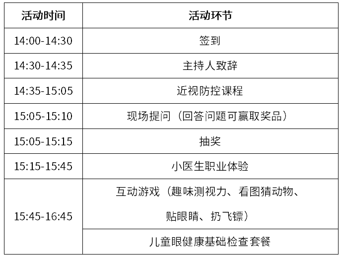 活動當日,現(xiàn)場小朋友可免費享受“兒童基礎眼健康檢查”1次,還可參與護眼小衛(wèi)士職業(yè)體驗活動。