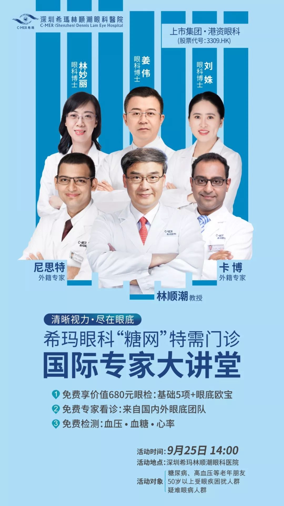 珠海希瑪林順潮眼科醫院關注“三高”人群的眼健康,專門開設了希瑪眼科“糖網”特需門診,并將于9月25日舉辦國際專家大講堂,普及眼健康知識,提供免費檢查、國內外眼底專家團隊免費問診等“一站式”診療服務,讓“三高”人群脫離眼病困擾,恢復清晰明亮的視力。