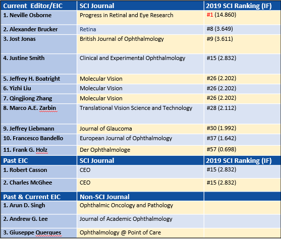 林順潮教授(亞太眼科學(xué)會(huì)前任會(huì)長(zhǎng)、亞太眼科科學(xué)院秘書(shū)長(zhǎng))是APJO的創(chuàng)刊及現(xiàn)任總編輯。 而Jost Jonas教授 (德國(guó)科學(xué)院院士、英國(guó)眼科雜志主編)于2019年成為第二總編輯。