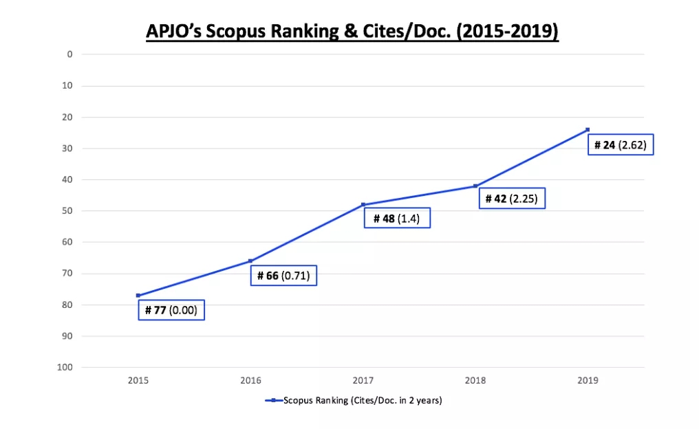APJO在2019年Scopus眼科期刊的排名是第24位,并呈持續(xù)上升的趨勢(shì) (見(jiàn)下圖)。估計(jì)在2020年全球SCI眼科期刊排行榜中,APJO可能位列第21-25位之間(SCI約有60本的眼科醫(yī)學(xué)雜志,而2020年的SCI排名將于2021年6月宣布)。