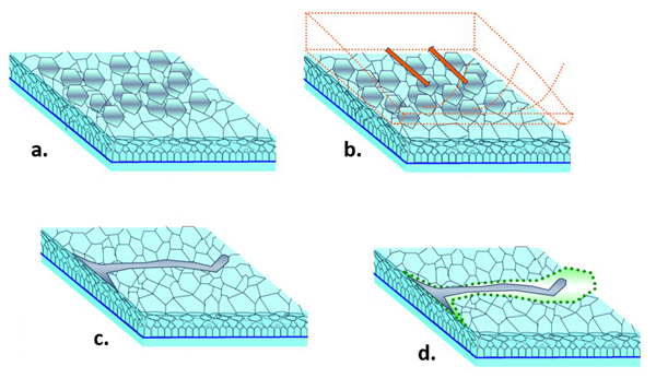 圖1:角膜上皮細(xì)胞發(fā)生破損(a),在眼瞼造成的壓力(b)下,慢慢形成條狀上皮卷(c),這一上皮卷與黏液組織等物質(zhì)結(jié)合終形成絲狀病變(d)。
